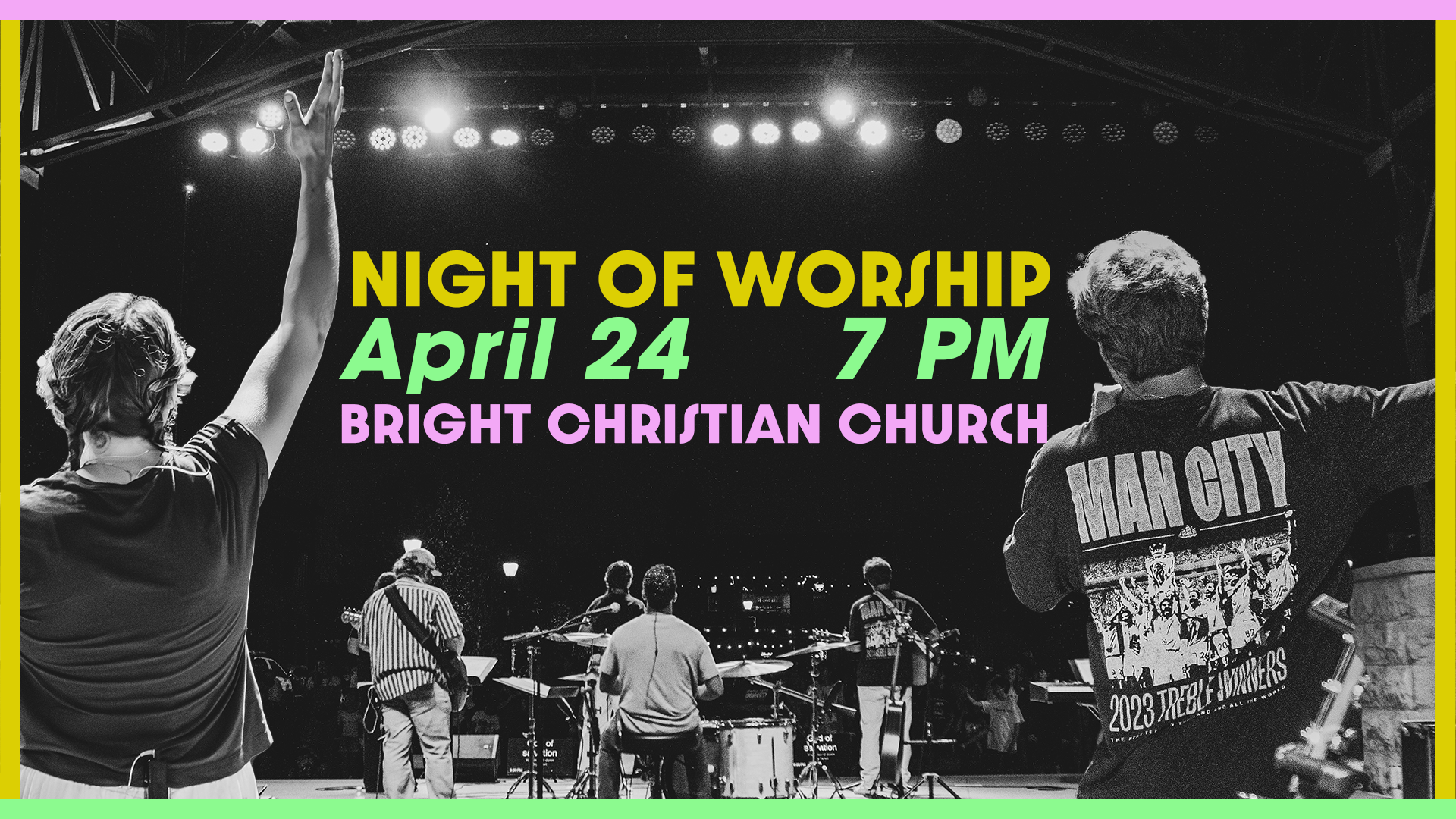 Night of Worship | Details: Get ready for an awesome Night of Worship! Join us for an evening of music as we lift our voices together in praise to God. Our worship team will lead us through a night of songs that celebrate who God is and what He has done, creating space for our church family to sing, reflect, and respond. Whether you love to sing loudly or simply want to soak in the truth of the lyrics, this will be a night to come together and worship wholeheartedly. Invite a friend, bring your voice, and come ready to praise! We hope to see you on Friday, April 24 at 7:00pm in the Worship Center! . Location: Worship Center